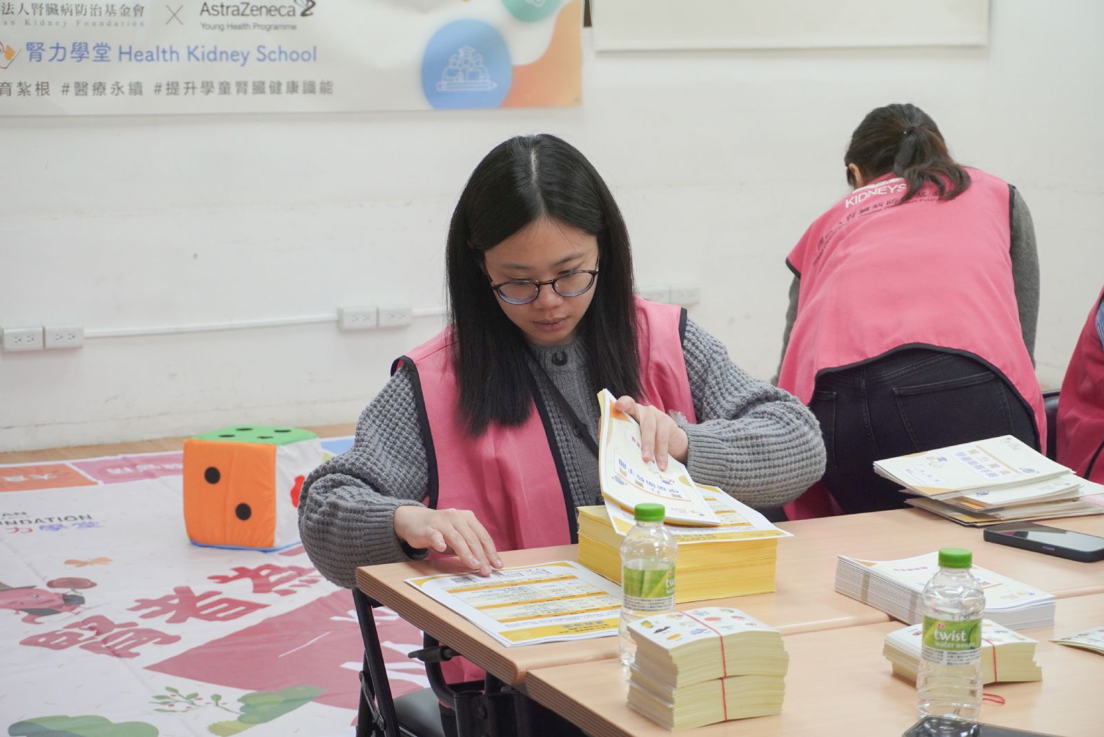 活動當天最核心的任務,便是將這一學期即將發送至學校的「2026腎力學堂線上課程」教材進行分裝與打包。臺灣AZ志工於包裝過程中仔細核對清單內容,確保每一份教材完整無缺,讓老師能順利進行教學。