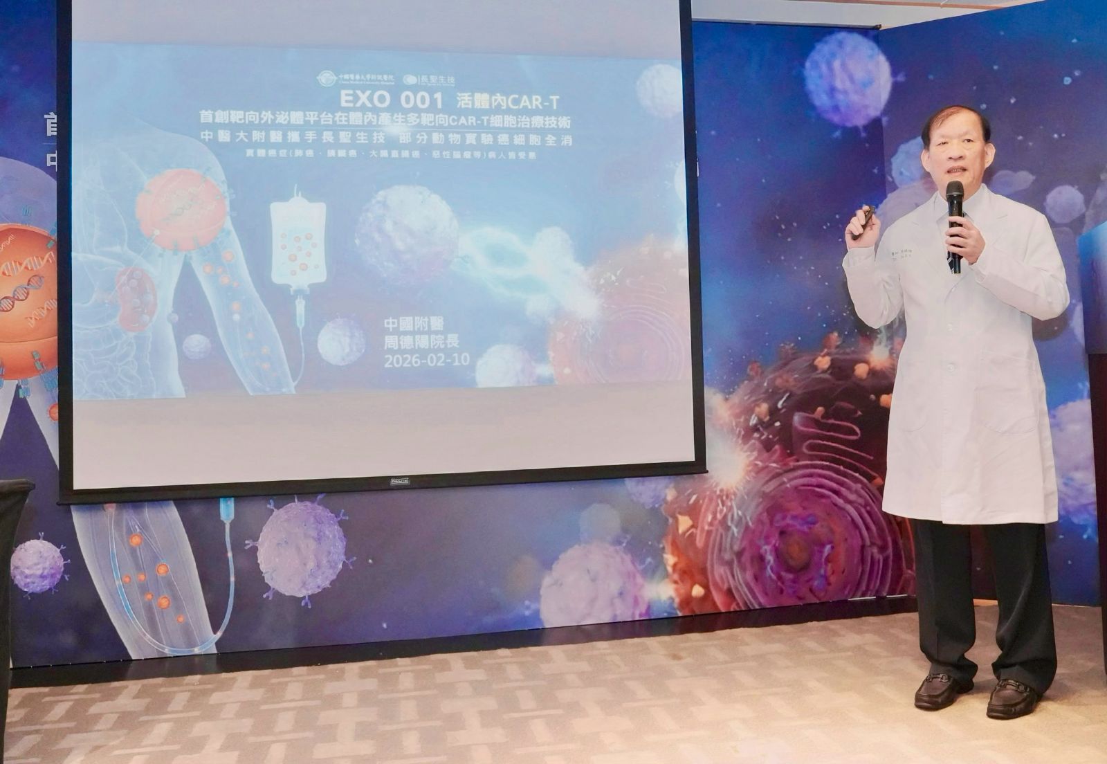 癌症長期為國人十大死因之首,全球癌症患者中實體腫瘤更超過九成,被視為CAR-T細胞治療最難突破的領域。中國醫藥大學附設醫院(以下簡稱中醫大附醫)今(10)日宣布,攜手長聖生技成功研發全球首創「EXO 001靶向外泌體平台」,可直接在體內編程T細胞,生成具多靶向辨識能力的奈米抗體CAR-T細胞,於多項實體癌動物實驗中展現顯著療效,甚至完全清除癌細胞,為末期實體癌治療帶來全新策略。