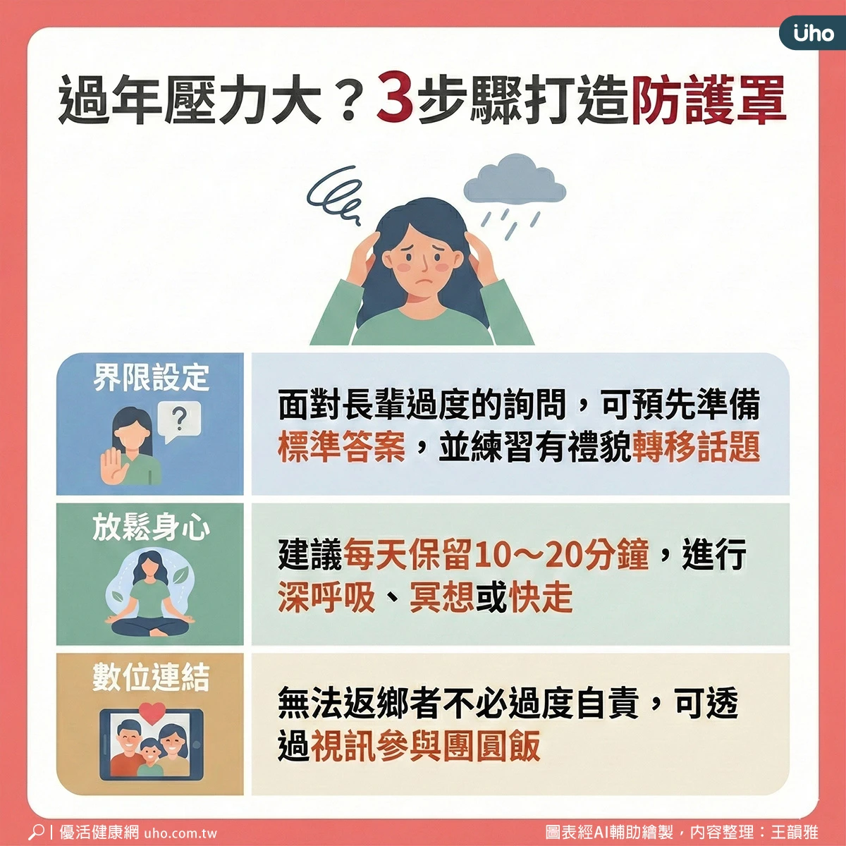 過年期間壓力大怎麼辦?鄭惠仁建議,民眾可嘗試「心理減壓法」來調適身心狀態。若在過年期間面對親友過度關心,可先從設定界線做起,再透過呼吸與冥想緩和情緒,幫助自己穩定心情、降低壓力。此外,若因工作或其他因素無法返鄉過年,也不必過度自責,可善用數位工具維繫情感連結。