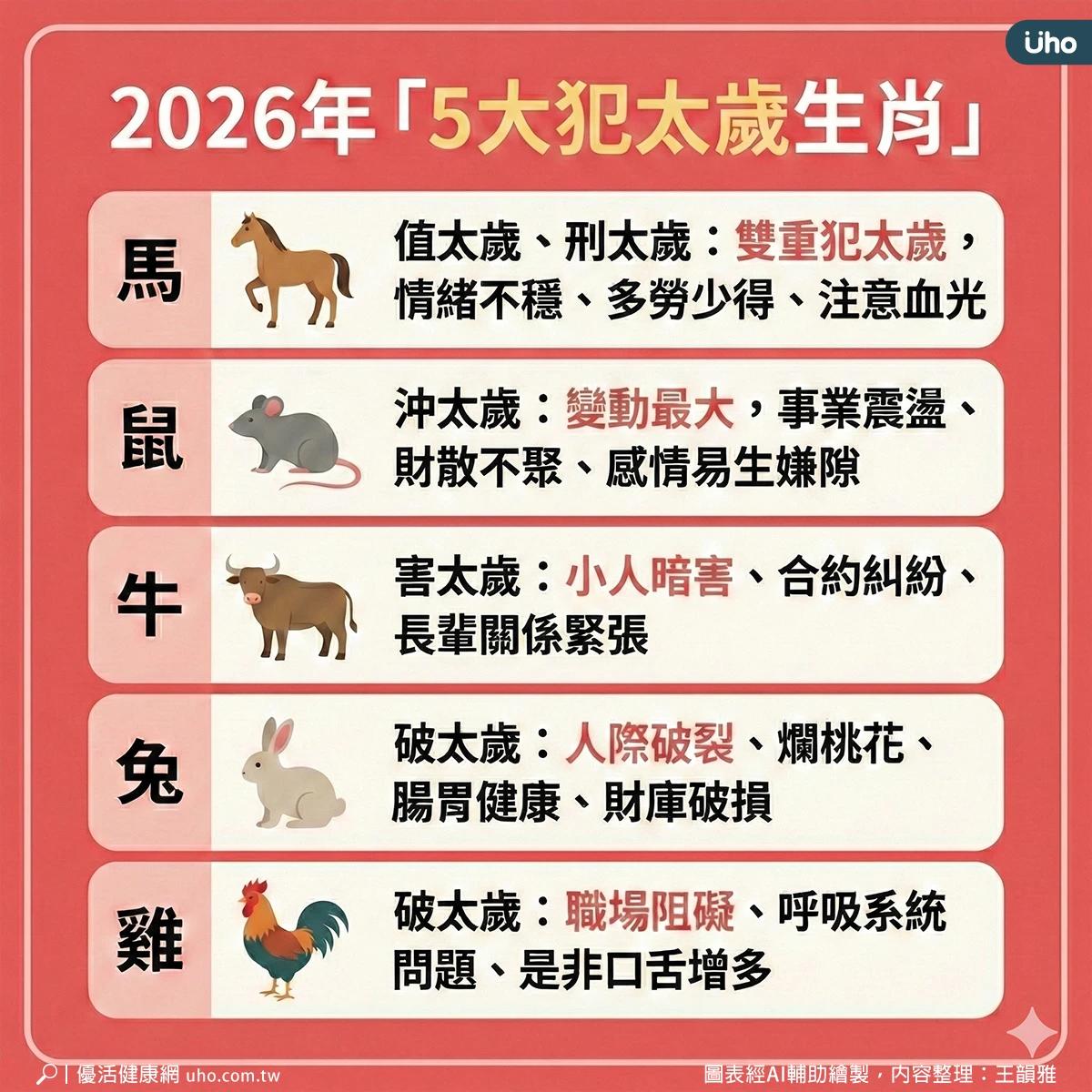 以下為2026年5大犯太歲生肖: