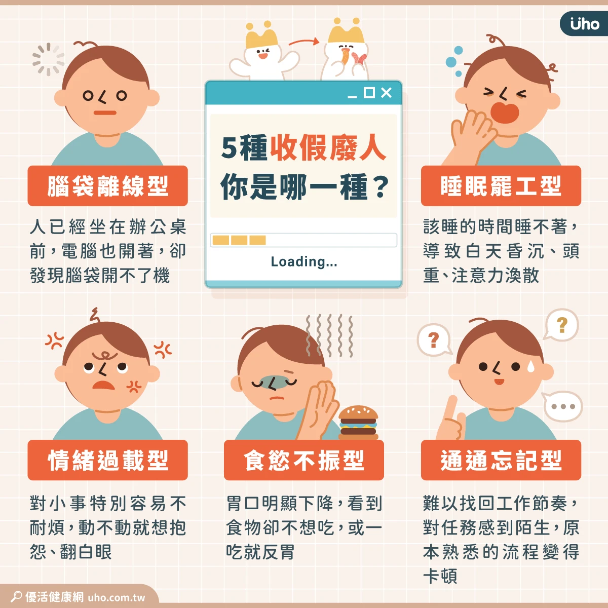 門診中常見收假後出現身心不適的患者,大致可分為5種類型,包括「腦袋離線型」、「睡眠罷工型」、「情緒過載型」、「食慾不振型」以及「通通忘記型」。楊聰財也進一步分析不同類型背後的原因、特徵以及收假建議。