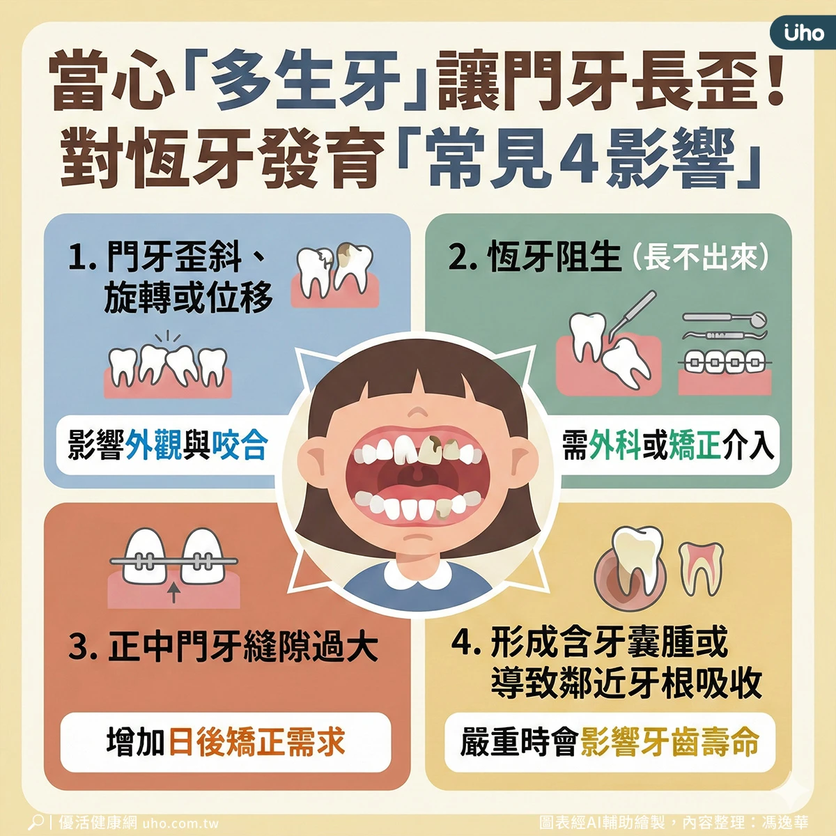 別小看多出來的牙齒,恐成為恆牙萌發的「路障」。彭緯綸解釋,多生牙並非只是「多一顆牙」這麼簡單,若未妥善處理,可能對恆牙發育與齒列造成長遠影響,因此早期診斷相當重要。可能的影響包括: