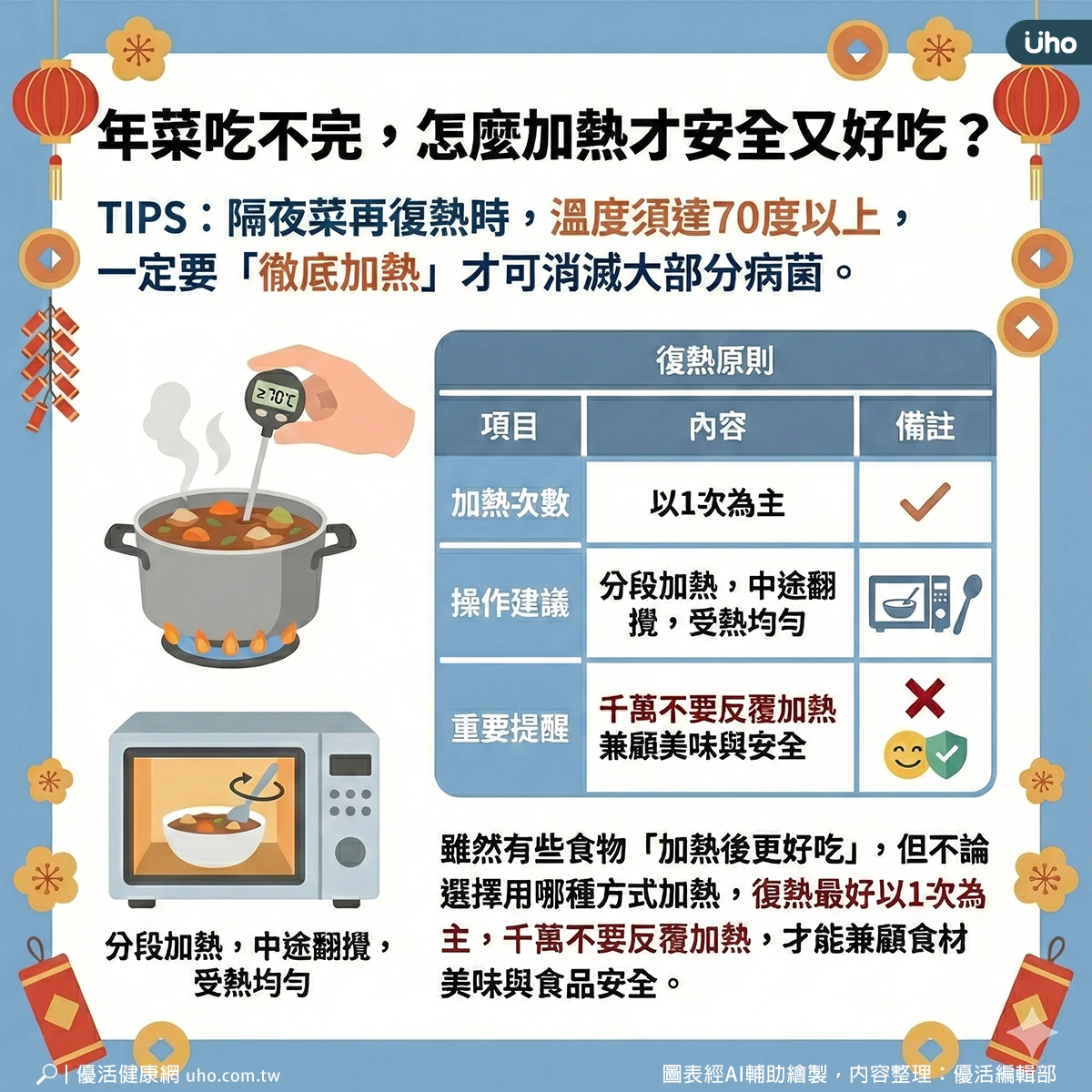 隔夜菜再復熱時,溫度須達70度以上,一定要「徹底加熱」才可消滅大部分病菌。若使用微波爐可分段加熱,可以試著中途稍微翻攪,讓受熱程度均勻。