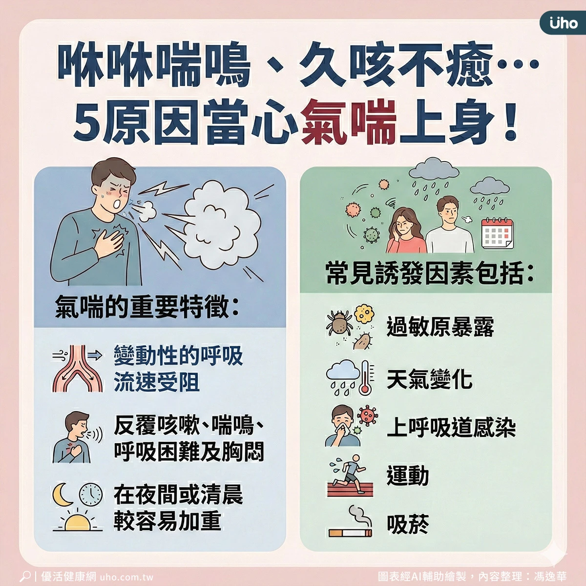 張嘉凌提醒,氣喘的診斷需綜合症狀表現、病程變化及相關檢查結果,通常需要一段時間的臨床觀察。若出現長期咳嗽未癒、夜間反覆喘鳴或活動時易喘等情形,建議及早就醫評估,把握治療時機,守護呼吸健康。