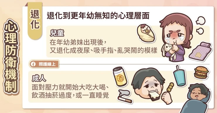 這個幾乎就不用再多解釋了,真的就是退化到更年幼無知的心理層面。這種情景也最容易出現在小孩身上。例如老大已經長到5歲,明明原本可以睡過夜,也不會尿床,發現老二出生後奪走了父母的專注力,老大就突然會夜尿,總是吸著大拇指,或大哭大鬧很難安撫。這就是屬於一種退化行為。