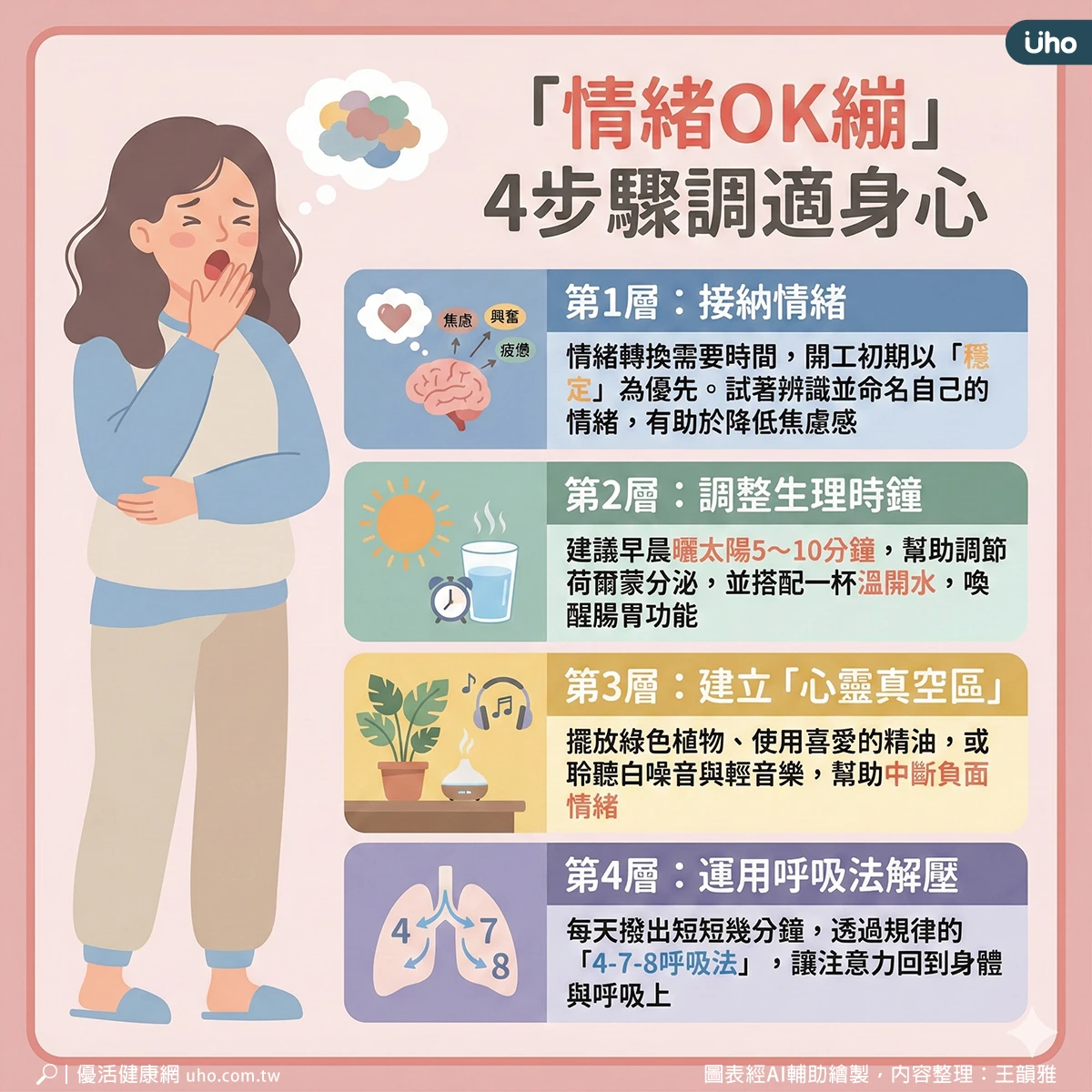 黃舒萱指出,面對收假後常見的焦慮與不適,建議民眾可以透過「情緒OK繃」的方法來調整身心,首先從接納自身情緒開始,接著循序漸進調整生理時鐘,並為自己建立「心靈真空區」,最後透過呼吸練習舒緩壓力,逐步重建日常節奏,找回身心平衡。