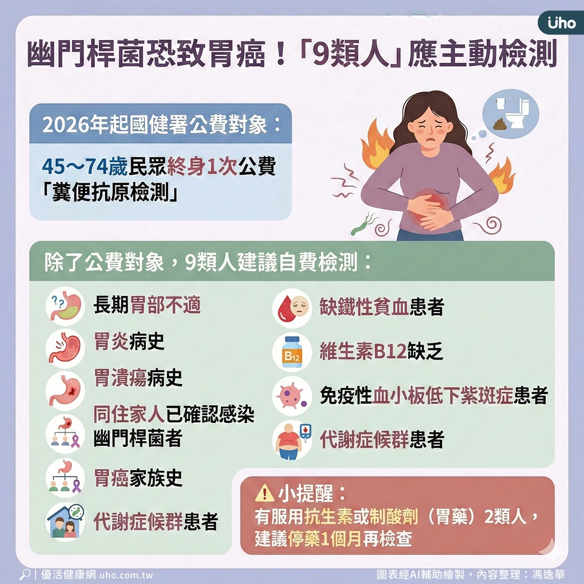 衛生福利部國民健康署自2026年起,全面提供45~74歲民眾終身1次公費「糞便抗原檢測胃幽門螺旋桿菌」服務。不過康本初提醒,有些情況可能會讓檢驗效果失準,包含正在服用抗生素或是制酸劑(胃藥)等2類人,就有可能影響到檢驗結果,建議至少停藥1個月再進行。