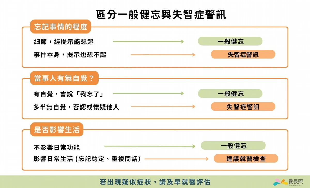 一般的健忘和失智造成的健忘,其實有幾個明顯不同之處,主要體現在3個面向:忘記事情的程度、當事人是否具有自覺、是否影響到生活。