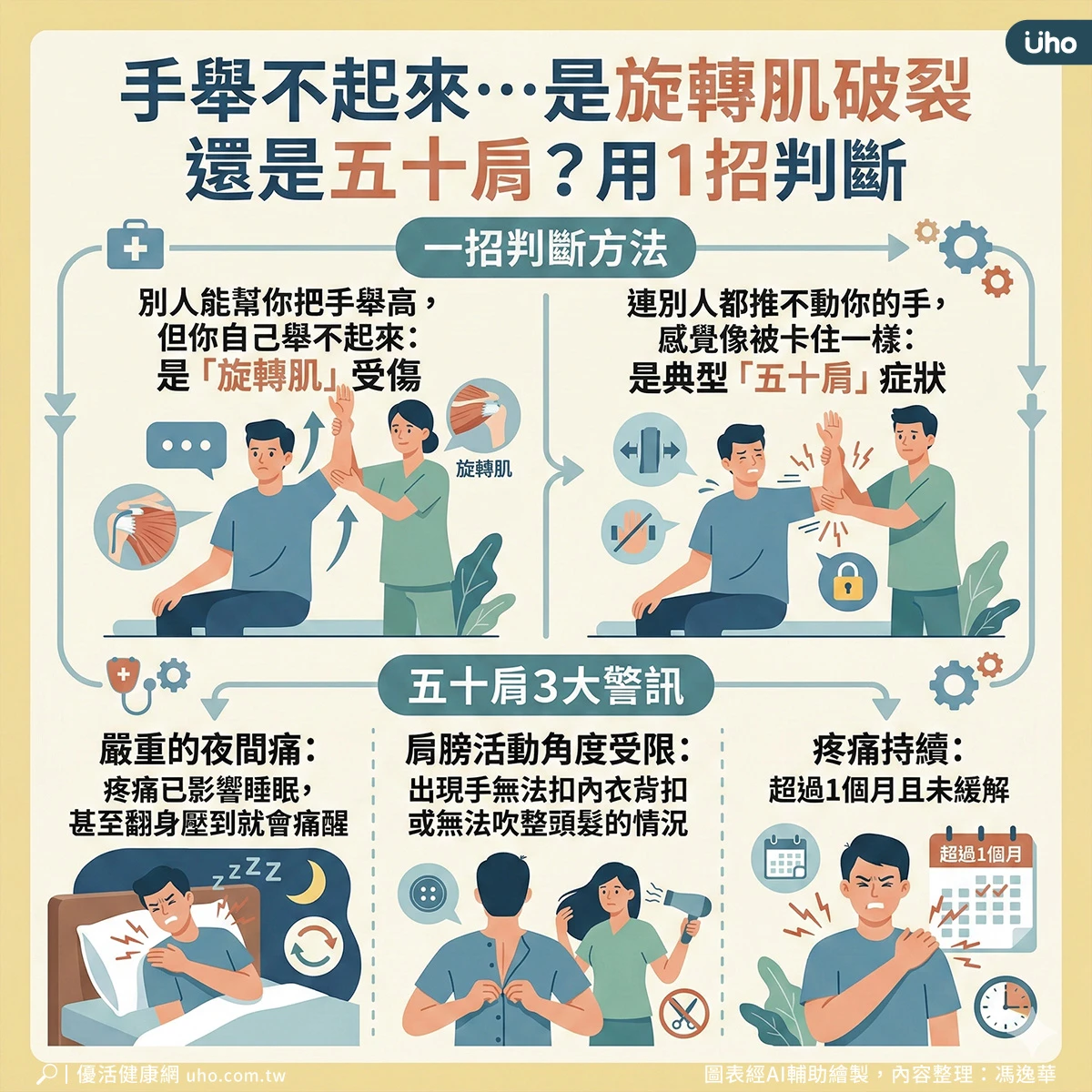 然而,許多民眾常將五十肩與「旋轉肌袖破裂」混淆。李智堯提供一個簡單的辨別方式: