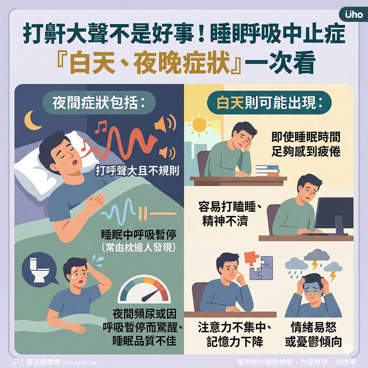 莊立邦說明,夜間打鼾不只是小問題,睡眠呼吸中止症常見症狀可分為夜間與白天兩大類: