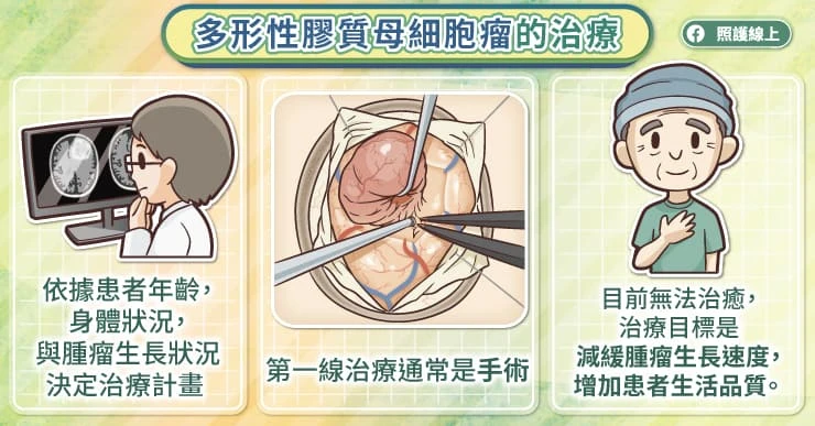 醫師會依據患者的年齡(大於70歲,或小於70歲),身體狀況,與腫瘤生長狀況來決定治療計畫。第一線治療通常是手術,需要看腫瘤長的位置來決定手術,而腦部組織負責視覺、運動、語言、或思考等地方,若多形性膠質母細胞瘤長進到腦組織之間,手術可能無法整個清除癌細胞組織,醫師僅能盡最大努力清除最多癌細胞組織。