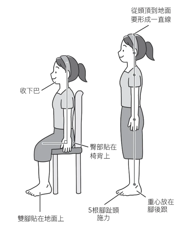 - 站立時從頸部到頭頂的線條,要像是從地面往上垂直的直線一樣。