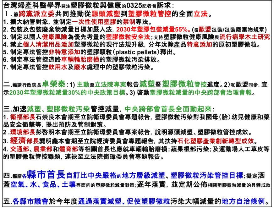 台灣婦產科醫學界 籲跨黨派立委共同推動從源頭減塑到塑膠微粒管控的全面立法 盼行政院長卓榮泰宣示2030年塑膠微粒減量30%
