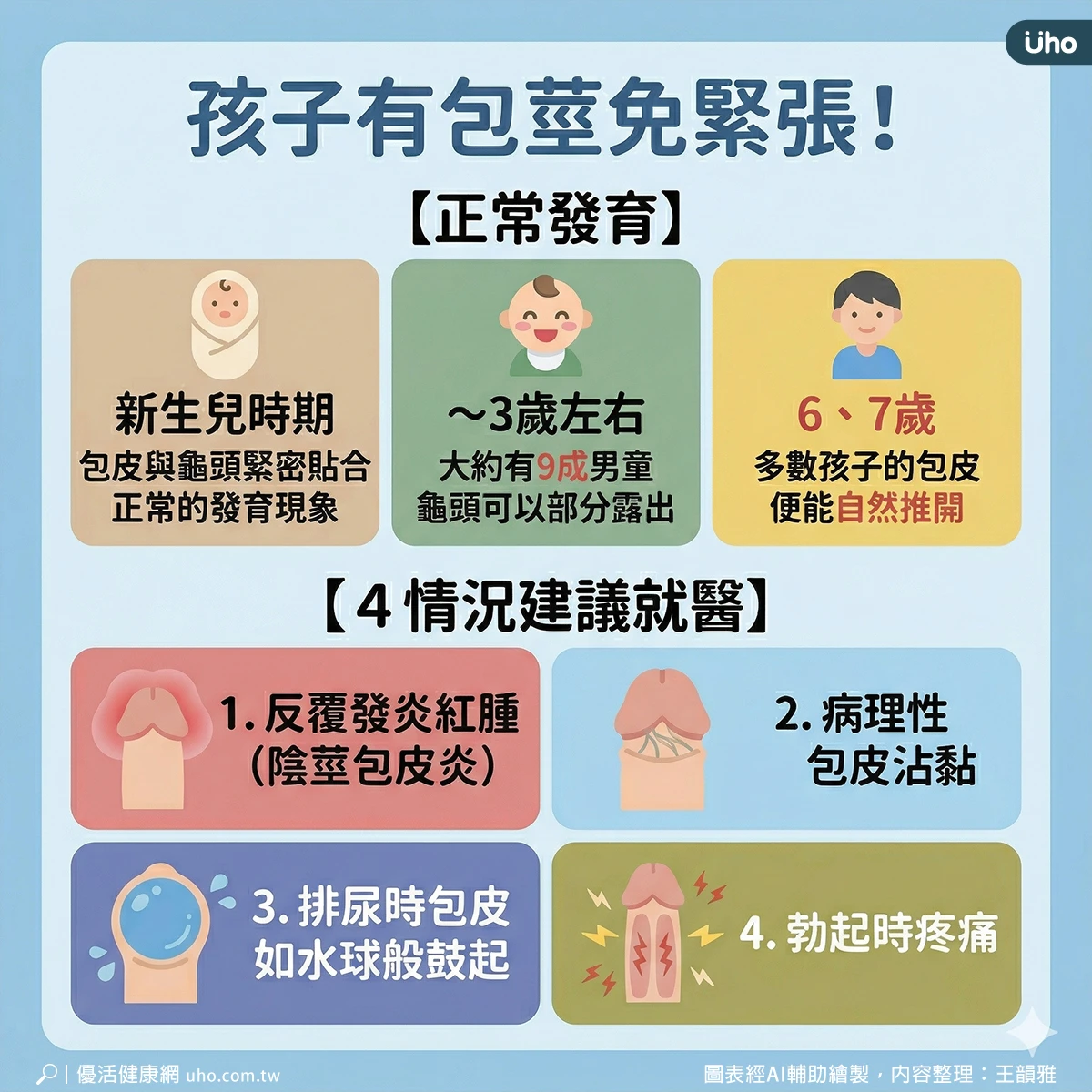 楊筱惠解釋,新生兒時期包皮與龜頭緊密貼合屬於正常的發育現象。大約有9成男童在3歲左右時,龜頭可以部分露出;到了6、7歲,多數孩子的包皮便能自然推開。