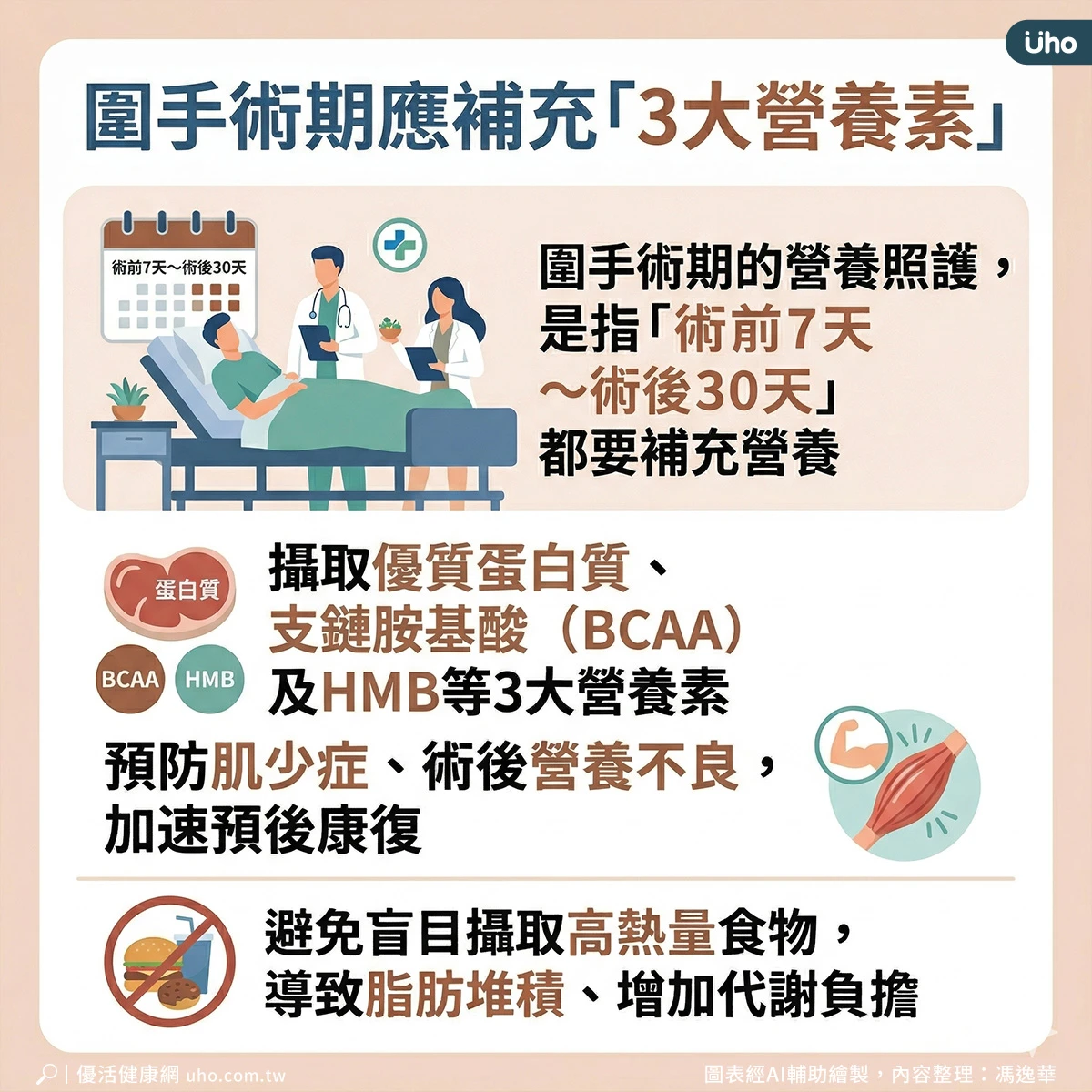 在營養補充方面,王照元建議,在圍手術期飲食中,醫療團隊會依個別患者健康狀況進行評估,視需要補充特定營養組合,如攝取優質蛋白質、支鏈胺基酸(BCAA)及HMB等營養素,能促進肌肉合成、減少肌肉流失,並有助於降低發炎反應、維持肌肉健康。