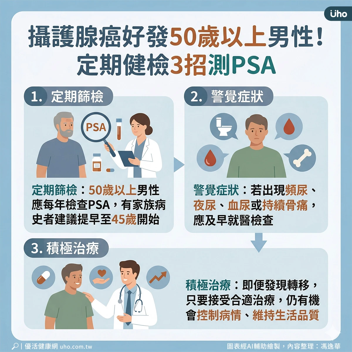- 定期篩檢:50歲以上男性應每年檢查PSA,有家族病史者建議提早至45歲開始。