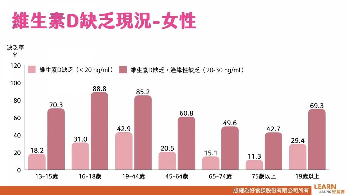 在台灣,無論是性別、年齡,維生素D攝取都嚴重不足!女性的維生素D攝取量,連建議量的一半都不到,男性則稍微好一點,但也是嚴重不足的狀態。