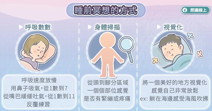 - 練習睡前冥想:睡前冥想屬於一種調整狀態的手段,讓人轉換到比較放鬆的階段,幫助我們的身體與心靈準備好,不要擔心明天或憂慮昨天,回到專注於現在的狀況,讓人更平靜地準備進入到夢鄉之中。下個分段會介紹幾種作法,你都可以視狀況自行調整,試試看不同的搭配,或發展出屬於自己的作法。