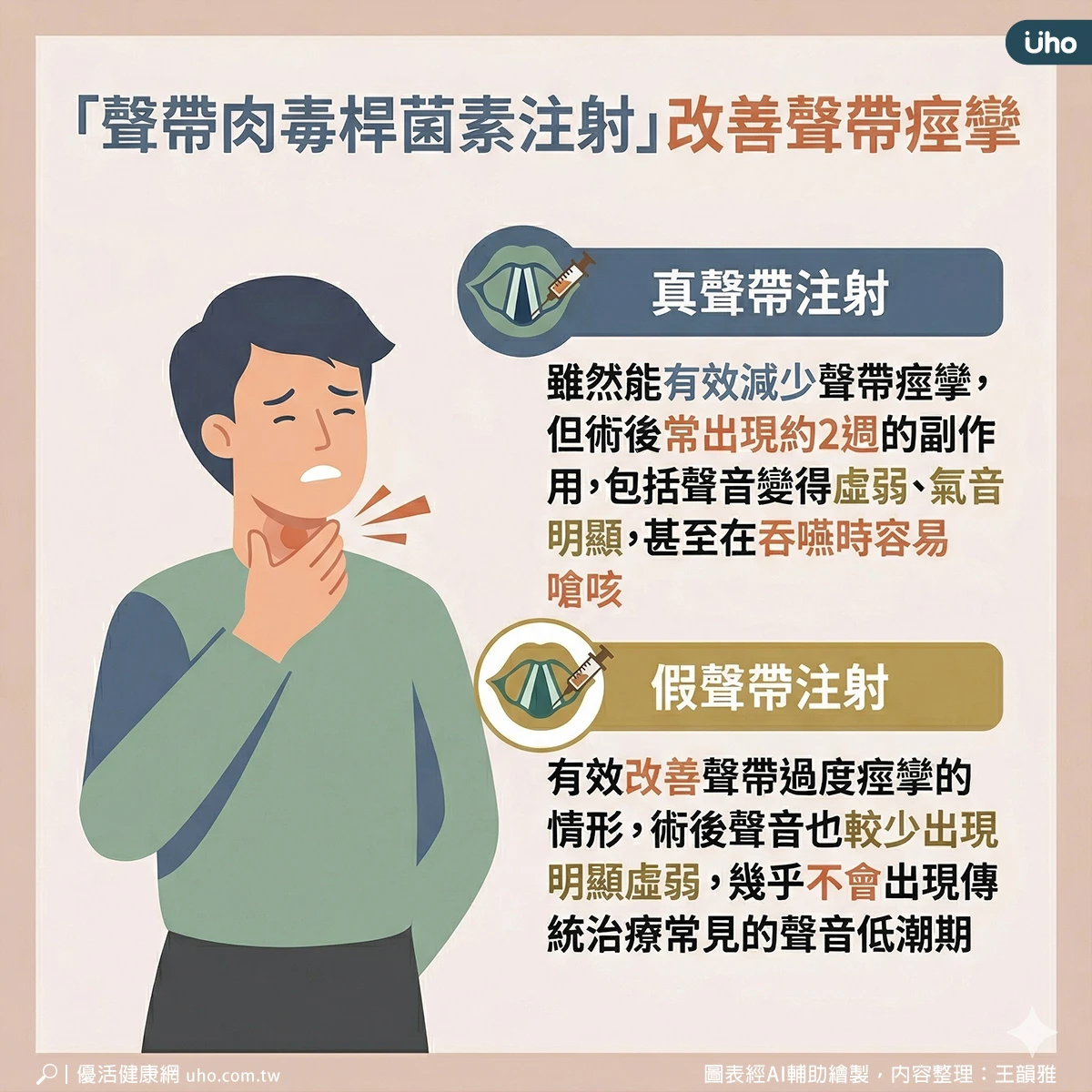- 真聲帶注射:雖然能有效減少聲帶痙攣,但術後常出現約2週的副作用,包括聲音變得虛弱、氣音明顯,甚至在吞嚥時容易嗆咳。