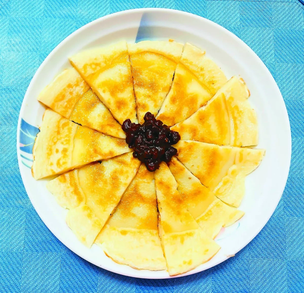 - 熱鍋,加入油,慢慢倒入麵糊(麵糊是糯米粉拌成,黏度比較高),蓋上鍋蓋,中小火煎至底層餅皮定型,塗上蜜紅豆,再倒上一層糯米糊,(要覆蓋滿紅豆才不會沾鍋),繼續蓋上鍋蓋再煎一段時間定型,翻面再煎至餅皮金黃、Q彈即可。