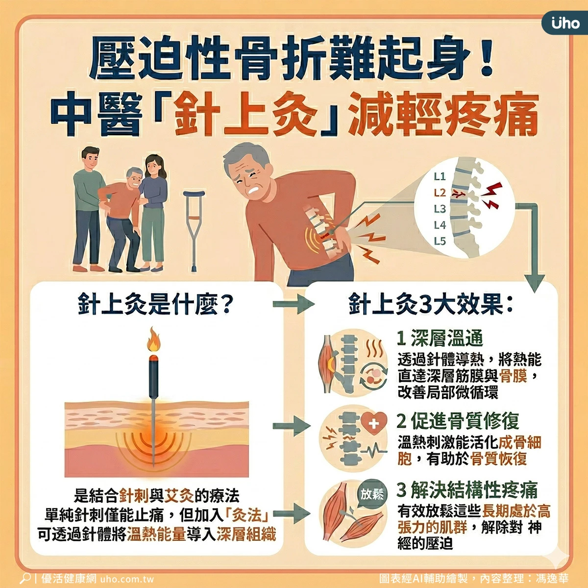 任東輝提到,針上灸是結合針刺與艾灸的療法,若只單純針刺可能僅能止痛,但加入「灸法」則可透過針體將溫熱能量導入深層組織,對於腰椎壓迫性骨折具有以下3種效果: