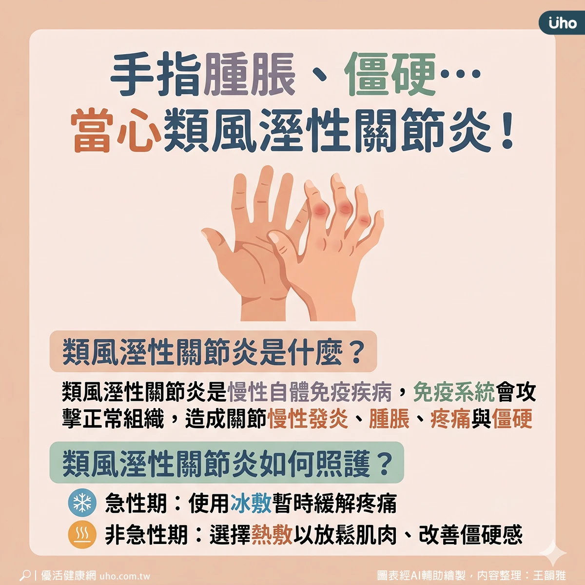 陳淑儀提醒,類風溼性關節炎患者除了藥物與針灸治療外,日常照護也十分重要,建議可透過適當的冷熱敷來舒緩不適,並配合均衡飲食與規律運動,以維持關節功能,才能減少症狀發作。