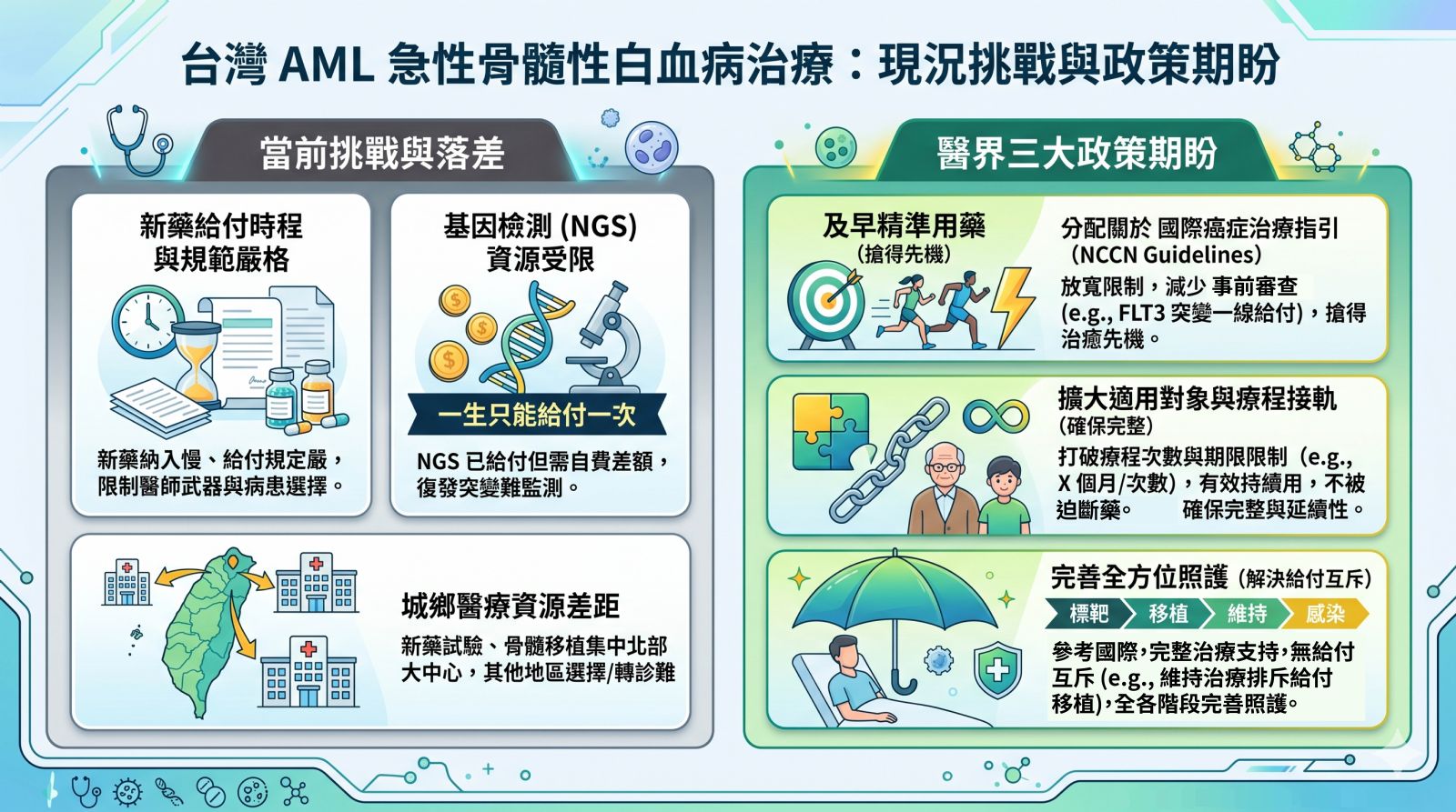 - 及早精準用藥: 急性骨髓性白血病治療往往只有一次機會,第一次治療若無效,後續成績將大打折扣。針對次世代基因定序(Next-Generation Sequencing,簡稱NGS)目前政策主要基於健保平權,預計於下半年擴大至不同癌別;期盼未來能進一步從現有已給付的癌別中,擴大給付範圍。同時,期盼精準標靶新藥能進一步放寬使用與療程的限制,與國際治療指引建議同步,減少或免除繁瑣的事前審查,讓病友第一時間搶得治癒先機。