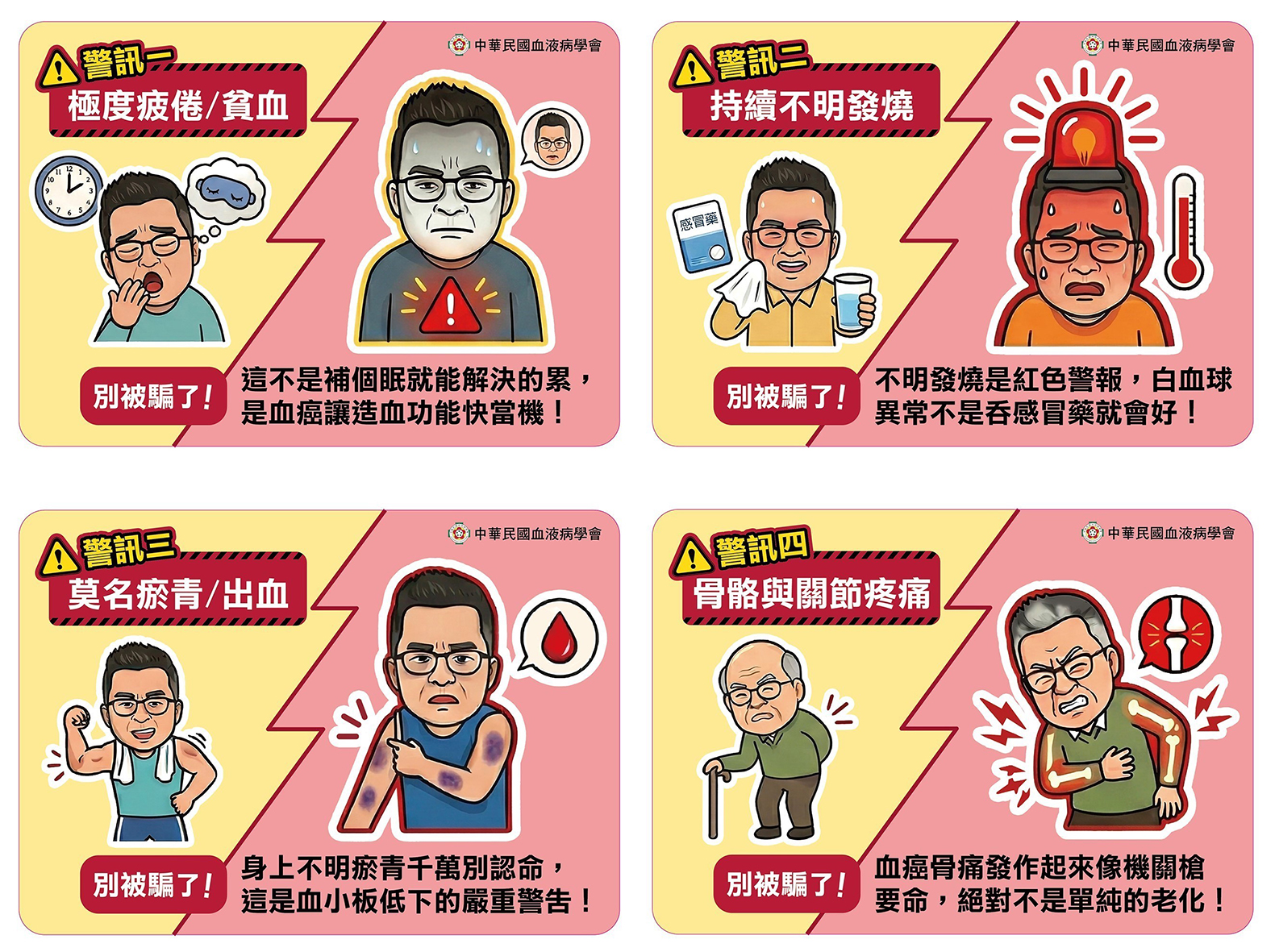 - 以為是太紅睡不飽(真實警訊:極度疲倦/貧血): 「別騙了!這不是喝咖啡、補個眠就能解決的累,是血癌讓造血功能快當機!」