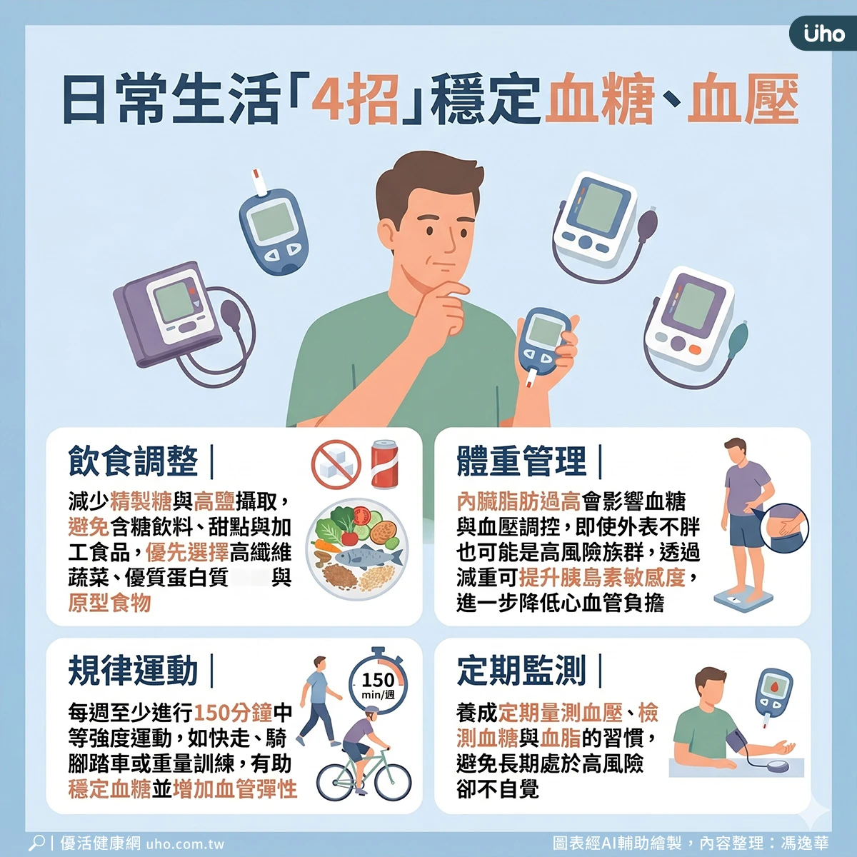 - 體重管理:內臟脂肪過高會影響血糖與血壓調控,即使外表不胖也可能是高風險族群。透過減重可提升胰島素敏感度,進一步降低心血管負擔。
