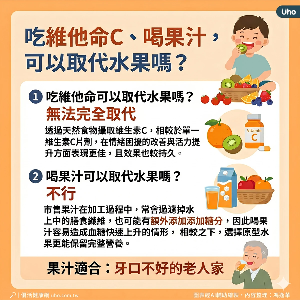 台灣兒童感染症醫學會常務監事、林口長庚兒童感染科顧問醫師黃玉成表示,維生素與單一營養補充劑無法完全取代天然水果的營養價值,透過天然食物攝取維他命C,相較於單一維他命C片劑,在情緒困擾的改善與活力提升方面表現更佳,且效果也較為持久。