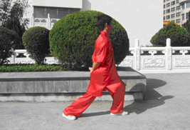 ![]() | 上肢動作:同上一動作、維持不變。 下肢動作:左腳彎曲不動,將重心轉移到左腳,身體微向右轉,右腳腳尖輕輕點地。提肛縮臀。 |