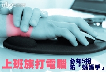 (優活健康網新聞部/綜合報導)上班族常使用滑鼠、鍵盤,當心「媽媽手」找上門!35歲的曾小姐平時上班工作內容多文書處理,需長時間使用滑鼠及鍵盤,下班回家後還有一堆家事要做,這個月開始大拇趾外側與手腕的地方腫脹、疼痛,這禮拜更惡化到睡覺都不安穩,翻個身也會痛醒,就醫檢查後確診「媽媽手」。手腕不正確使力、拇指反覆動作造成滑膜炎衛福部南投醫院職能治療師李雅萍說明,「媽媽手」是狹窄性肌腱滑膜炎,造成的原因與手腕不正確使力或拇指長期反覆動作有關,使「外展拇長肌」及「伸拇短肌」肌腱發炎,造成肌腱間滑動困難,引起手腕疼痛。5招伸展兼訓練肌力 預防媽媽手改善媽媽手的方法除了休息或穿戴副木減少大姆指使用,有時會注射少量類固醇於患部或以超音波治療消腫減輕疼痛。不過預防勝於治療,李雅萍職能治療師建議,平常可做5招手部伸展運動及肌力訓練,強化手部肌力,避免造成媽媽手:1) 拇指指尖碰觸小指指尖,維持5秒後打開,反覆10次。2) 手腕伸展動作。手掌向下壓再往身體拉或手掌向上抬再往身體拉,維持10秒後放開,兩組動作反覆10次。3) 手腕伸展屈曲肌力訓練,掌心朝上握住水瓶或掌心朝下握住水瓶,讓手腕向上彎曲停住並維持10秒後再慢慢放下,兩組動作反覆10次。4) 握力訓練,可利用網球或軟橡膠球用力握緊維持5秒後打開,反覆10次。5) 利用橡皮筋訓練手指伸展肌力,手指把橡皮筋撐開5秒後放鬆,反覆10次。